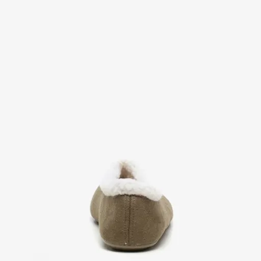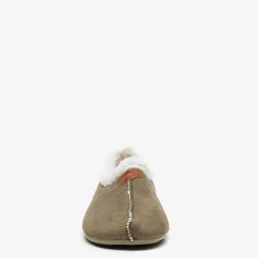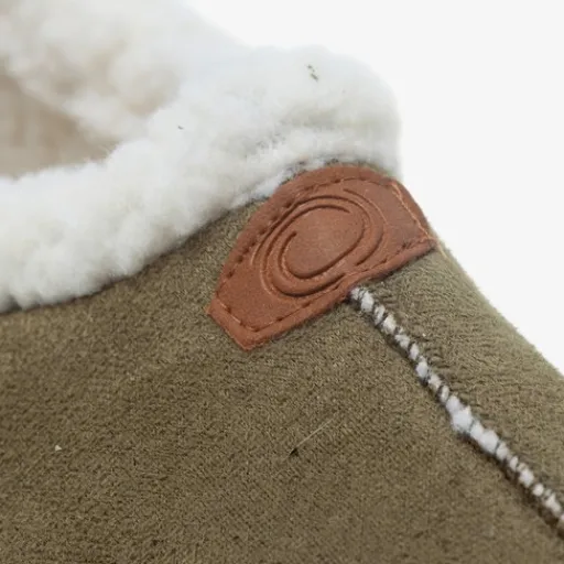 Groene pantoffels voor dames van Thu!s. Gemaakt van textiel, een zachte teddyvoering van textiel en een stevige zool. De pantoffels hebben een comfortabel voetbed.