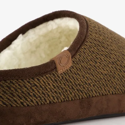 Warme, bruine heren pantoffels van Thu!s. Deels gevoerd en gemaakt van textiel. De buitenzool heeft een antislip zool wat ervoor zorgt dat je niet uitglijdt.