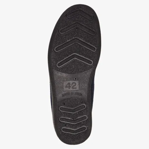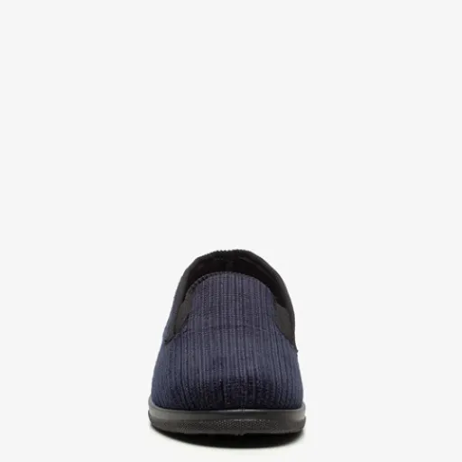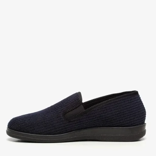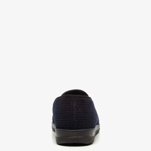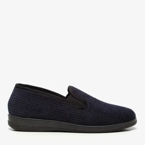 Donkerblauwe pantoffels voor heren. Gemaakt van textiel, een binnenwerk van textiel en een stevige zool van rubber. De pantoffels hebben elastische inzetjes voor een makkelijke instap. Het comfortabele, zachte voetbed is gemaakt van textiel.