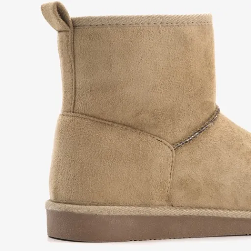 Hoge, taupe kleurige pantoffels voor dames. Gemaakt van textiel, een binnenwerk van textiel en een stevige zool. De pantoffels hebben een aantreklusje aan de achterzijde en een zachte, warme teddyvoering.