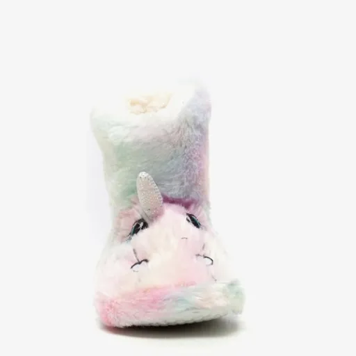 Vrolijke pantoffels in de vorm van een unicorn. Gemaakt van fluffy textiel, een binnenwerk van textiel en een stevige zool. De buitenzool is voorzien van grove noppen wat zorgt voor extra grip. De unicorn pantoffels hebben een gezichtje op de neus en pastelkleurtjes op het bovenwerk. Let op: de pantoffels vallen klein. We adviseren je een maat groter te bestellen.
