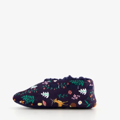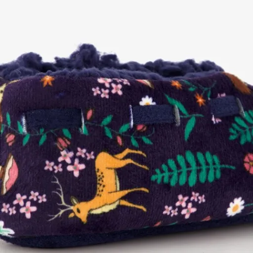 Donkerblauwe Thu!s sloffen voor meisjes. Gemaakt van textiel met een warme teddyvoering en een profielzool van rubber. Deze mooie sloffen hebben een herfst printje met bosdieren, bloemen en bladeren. Let op: de sloffen kunnen kleur afgeven op vloerbedekkingen!