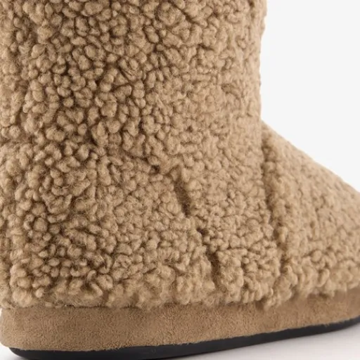 Hoge, beige teddy pantoffels voor heren van Thu!s. Het binnen- en binnenwerk zijn gemaakt van textiel en de profielzool van rubber. De pantoffels zijn voor een deel voorzien van een zachte voering en de binnenzool van textiel is niet uitneembaar.