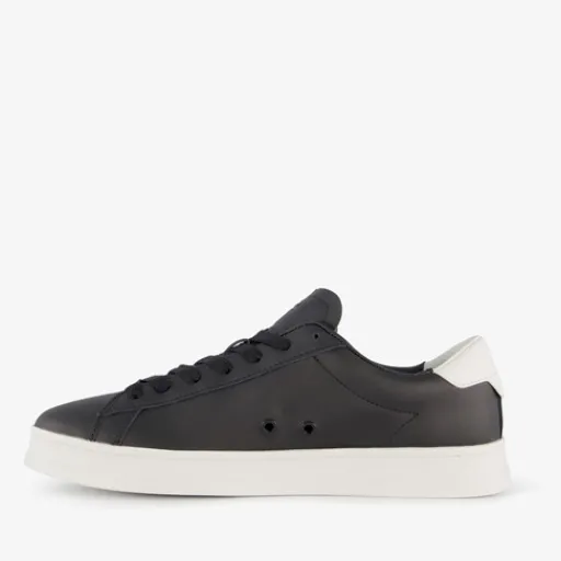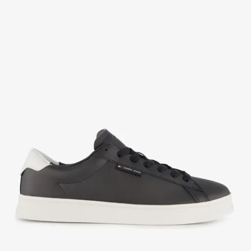Zwarte Tommy Hilfiger sneakers voor heren. Het buitenwerk is gemaakt van leer, het binnenwerk van textiel en de profielzool van rubber. Voorzien van een vetersluiting en een uitneembare binnenzool van synthetisch materiaal. De sneakers hebben 2 perforatiegaten aan de binnenzijde, een witte inzet op de hak en een contrasterende, witte buitenzool.