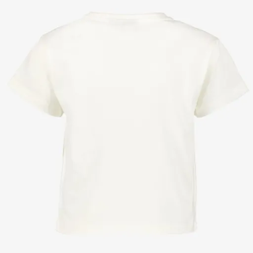 Cropped, wit T-shirt voor meisjes. Voorzien van korte mouwen en een hoge, ronde hals. Het T-shirt heeft een tekstopdruk met bloemen aan de voorzijde. Gemaakt van 100% katoen.