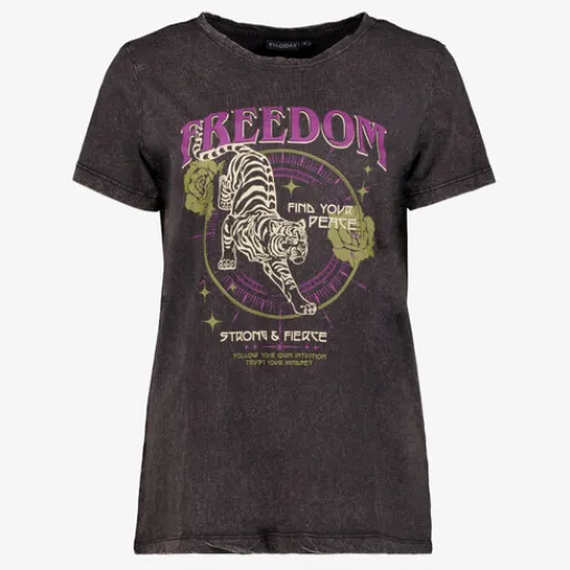 Zwart T-shirt met een opdruk van een tijger aan de voorzijde van TwoDay. Voorzien van een ronde hals en korte mouwen. Het shirt heeft een acid wash en is gemaakt van 100% katoen.