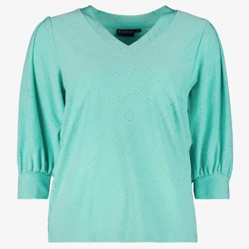 Aqua groene dames blouse met gaatjesborduurwerk in de stof. Voorzien van halflange mouwen met elastiek en een V-hals. De blouse is gemaakt van 95% polyester en 5% elastaan.