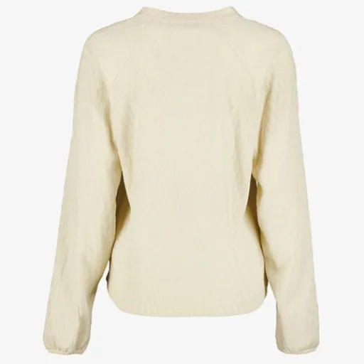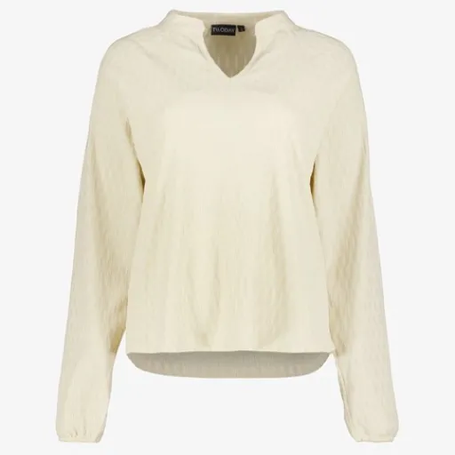 Beige blouse voor dames uit de TwoDay collectie. Voorzien van een V-halsje en lange mouwen met elastiek. De blouse heeft een structuur in de stof en is gemaakt van 99% polyester en 1% elastaan.