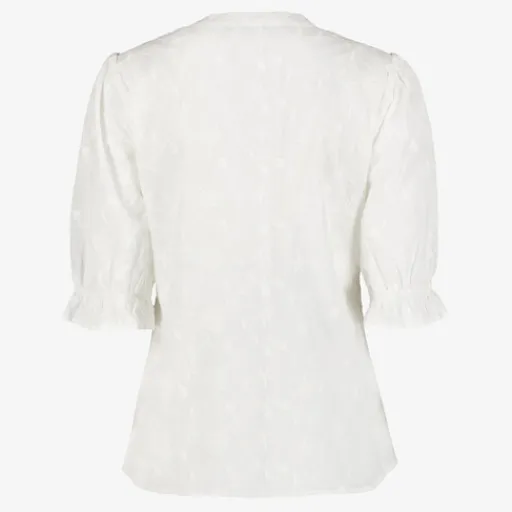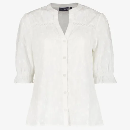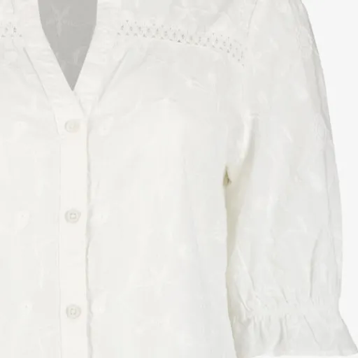 Witte embroderie blouse voor dames van TwoDay. Voorzien van driekwart mouwtjes met elastiek, een ronde hals met V-opening en knoopsluitingen. De blouse is gemaakt van 100% katoen.