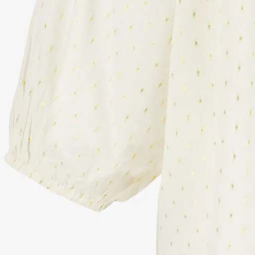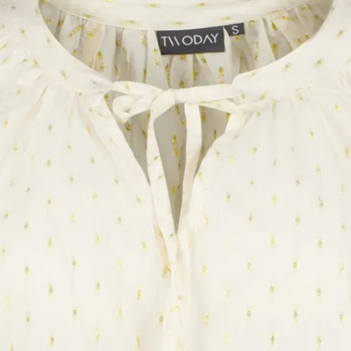 Gebroken witte blouse voor dames. Voorzien van driekwart mouwen met elastiek en een V-hals met strikkoordjes. De blouse hebben subtiele glitter stipjes all over. Gemaakt van 100% katoen en lurex.
