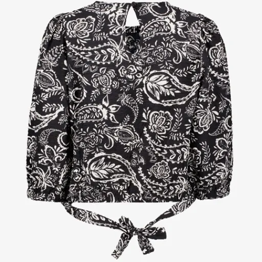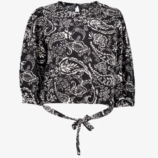 Zwarte blouse met paisley print voor dames. Voorzien van halflange mouwen, een ronde hals en een knoopje in de nek. De blouse heeft strikkoorden aan de onderzijde en is gemaakt van 99% polyester en 1% elastaan.