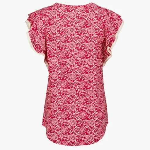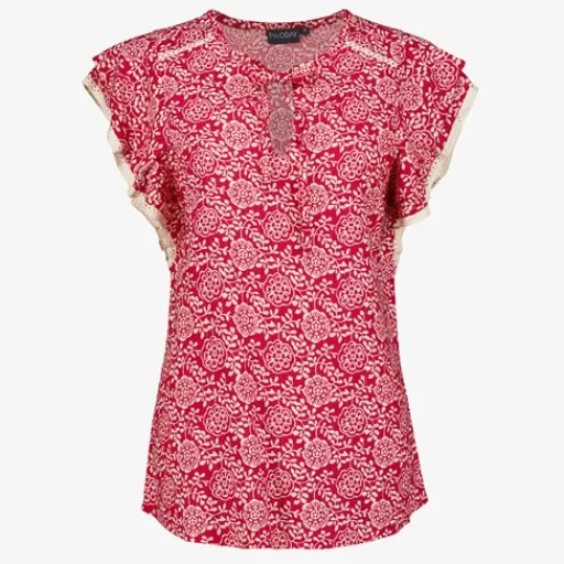 Rode blouse met een witte bloemenprint voor dames uit de TwoDay collectie. Voorzien van een V-hals met strikje en vlindermouwen. De blouse heeft subtiele glitter details in de stof en geborduurde details op de schouders en bij de mouwen. Gemaakt van 98% viscose en 2% metaal. Combineer de blouse met de bijpassende rok en maak je outfit compleet!