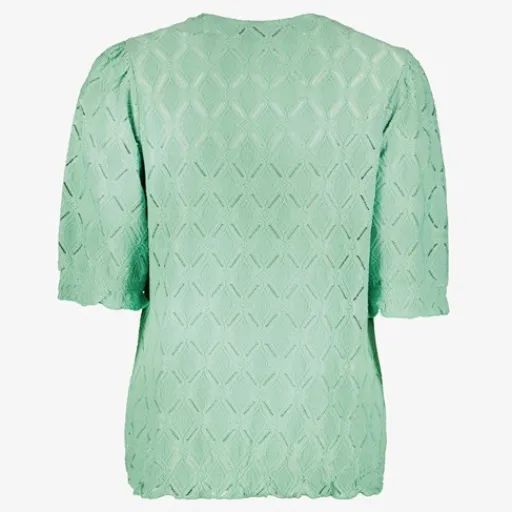 Mintgroen shirt voor dames. Voorzien van een ronde hals en halflange mouwtjes met ruches. Het shirt heeft perforaties in de stof en is gemaakt van 98% polyester en 2% elastaan.