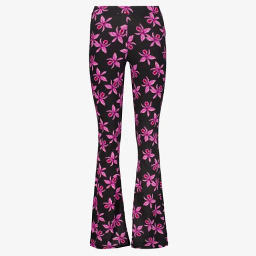 Zwarte flared broek met een roze bloemenprint voor dames uit de TwoDay collectie. Voorzien van een elastische tailleband en wijde broekspijpen. Gemaakt van 96% polyester en 4% elastaan.