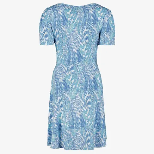 Blauwe jurk met print voor dames van TwoDay. Voorzien van een ronde hals, korte mouwen en een ceintuurtje in de taille. Gemaakt van 90% polyester en 10% elastaan,