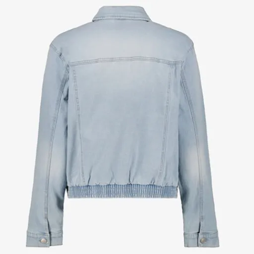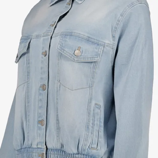 Lichtblauw denim jack voor dames. Voorzien van knoopsluitingen, twee borstzakjes en elastiek aan de onderzijde. De spijkerjas heeft een comfortabele, stretchy pasvorm. Gemaakt van 98% polyester en 2% elastaan.
