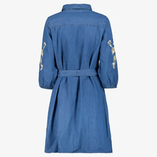 Donkerblauwe denim jurk voor dames van TwoDay. Voorzien van een omgeslagen kraagje, koopsluiting aan de voorzijde en een ceintuur in de taille. De jurk heeft driekwart mouwen met geborduurde bloemen en is gemaakt van 100% katoen.
