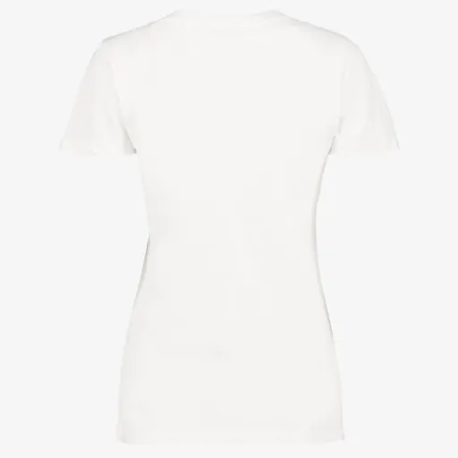 Wit T-shirt voor dames. Voorzien van korte mouwen en een ronde hals. Het shirt heeft een tekstopdruk met lila bloemen aan de voorzijde. Gemaakt van 100% katoen.