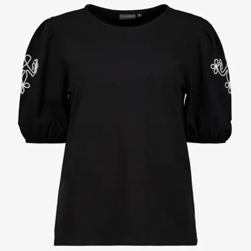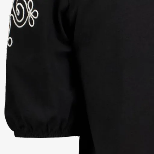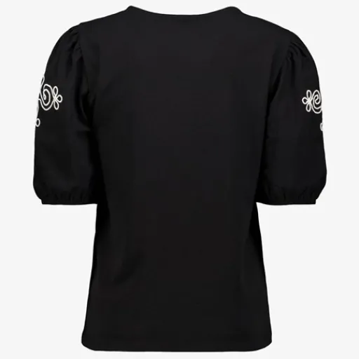 Zwart T-shirt voor dames. Voorzien van een ronde hals en halflange mouwen met geborduurde, witte details. Gemaakt van 95% katoen en 5% elastaan.
