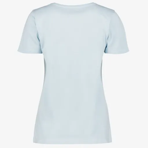 Lichtblauw T-shirt voor dames. Voorzien van korte mouwen, een ronde hals en een grote opdruk aan de voorzijde. Gemaakt van 100% katoen.