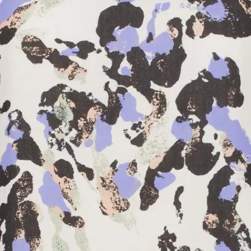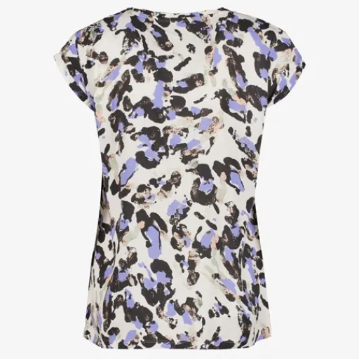 Wit dames T-shirt met een all over print in de kleuren paars en zwart. Voorzien van korte mouwen en een ronde hals. Het shirt is gemaakt van 100% ecovero viscose.