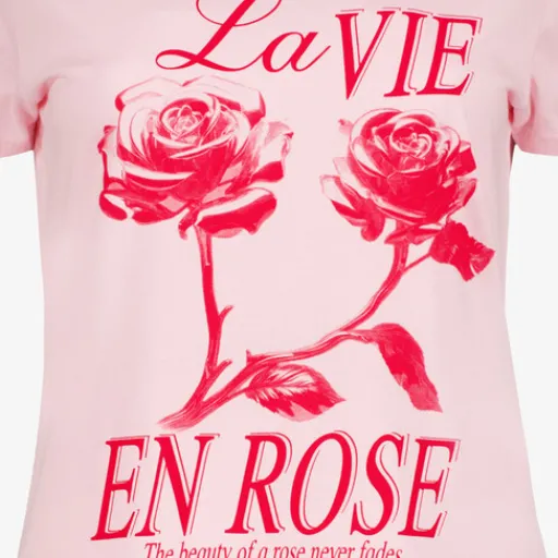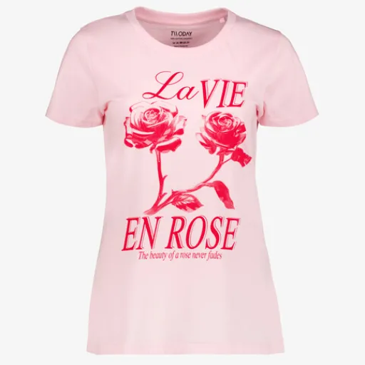 Roze T-shirt voor dames van TwoDay. Voorzien van korte mouwen, een ronde hals en een opdruk met rozen en tekst aan de voorzijde. Het shirt is gemaakt van 100% katoen.