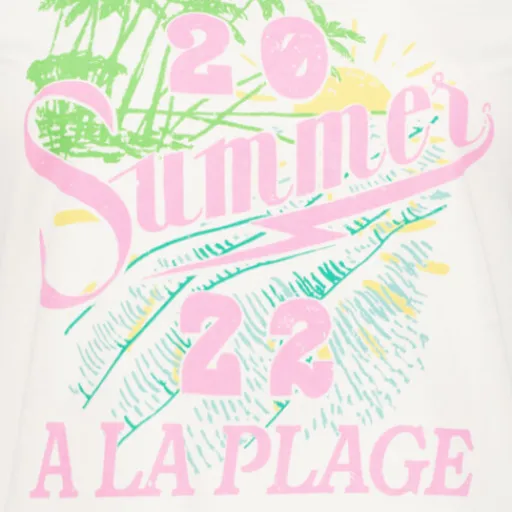 Wit T-shirt voor dames. Het shirt heeft een zomerse opdruk op de borst en is gemaakt van 100% katoen.