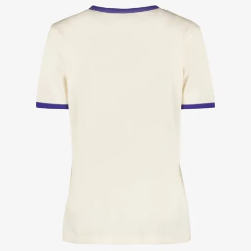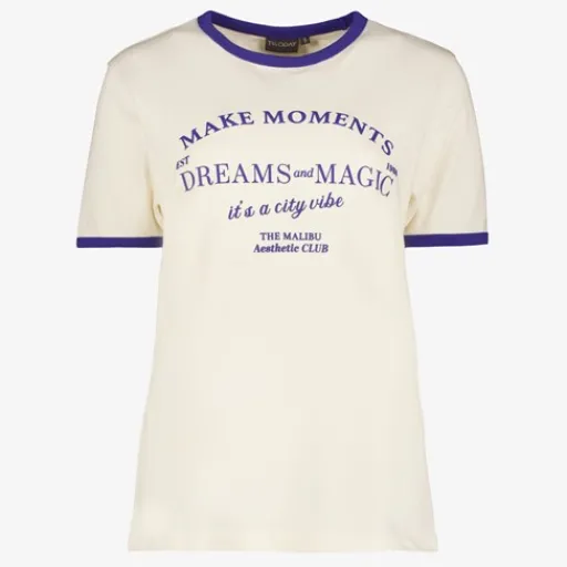 Witte dames T-shirt uit de TwoDay collectie. Voorzien van blauwe boorden bij de hals en de mouwen en een blauw tekstopdruk aan de voorzijde. Gemaakt van 100% katoen.