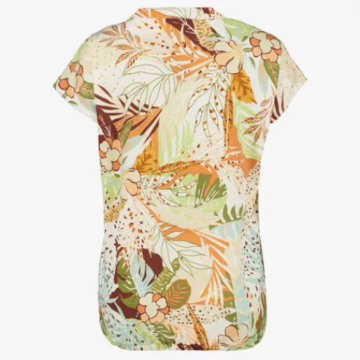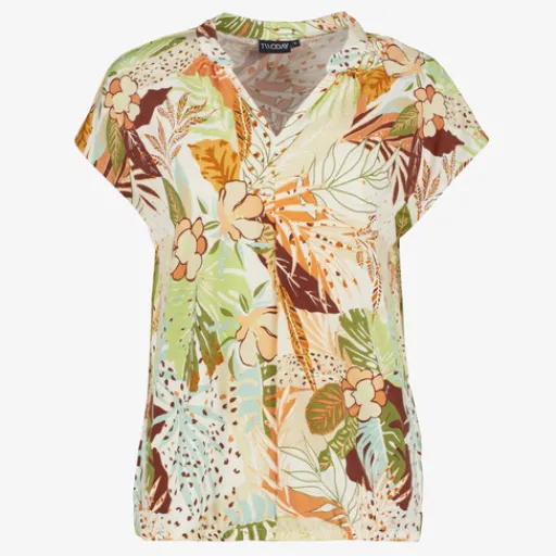 Dames top met een bloemenprint in de kleuren geel, oranje en groen. Voorzien van een V-hals en korte mouwen. Gemaakt van 95% polyester en 5% elastaan.