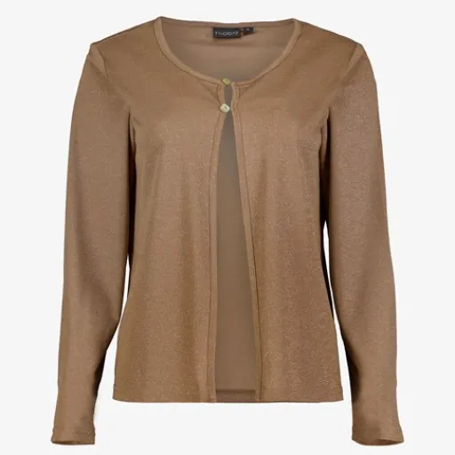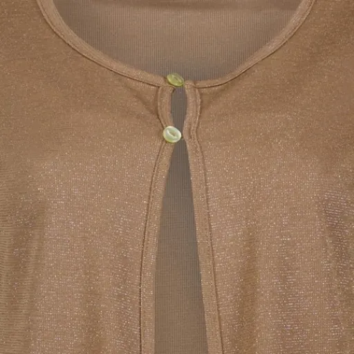 Bruin vestje met subtiele glitters. Voorzien van twee kleine knoopjes aan de bovenzijde. Het vestje is gemaakt van 75% polyester, 20% lurex en 5% elastaan.