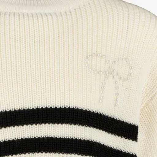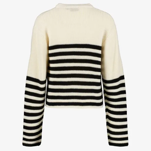 Witte, gebreide trui met zwarte strepen voor meisjes uit de TwoDay collectie. Voorzien van een ronde hals, lange mouwen en een strikje van kralen op de borst. Gemaakt van 100% acryl.