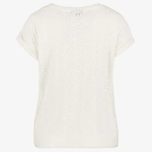 Wit broderie T-shirt voor dames. Voorzien van korte mouwen, een ronde hals en geknoopt detail aan de onderzijde. Het shirt is gemaakt van 95% polyester en 5% elastaan.