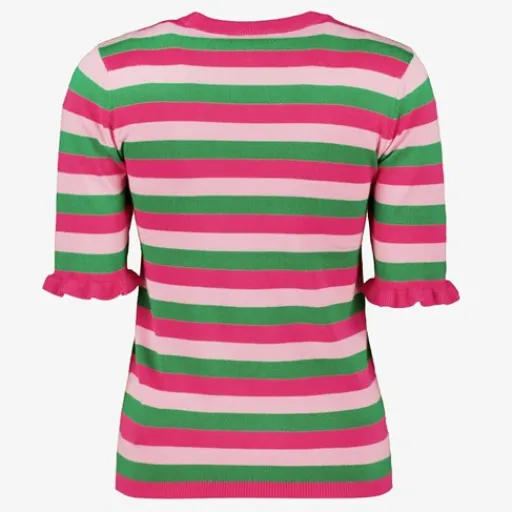 Roze dames trui met groene strepen van TwoDay. Voorzien van een ronde hals en driekwart mouwen met ruches. Gemaakt van 70% viscose en 30% polyester.