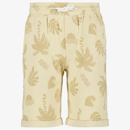 Beige short voor jongens. Voorzien van een elastische tailleband met aantrekkoordjes en twee steekzakken. De short heeft een omslag bij de broekspijpen en een zomerse print. Gemaakt van 100% katoen.