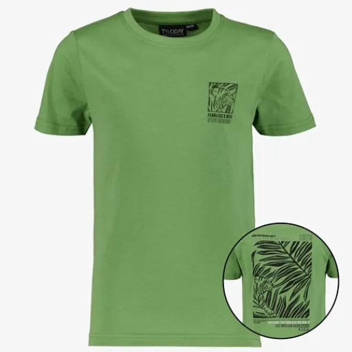 Groen jongens T-shirt met een stoere backprint. Voorzien van een ronde hals, korte mouwen en een opdruk op de borst van een tijger in de jungle. Gemaakt van 100% katoen.