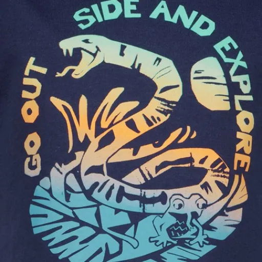 Donkerblauw jongens T-shirt met een stoere opdruk. Voorzien van een ronde hals en korte mouwen. Gemaakt van 100% katoen.