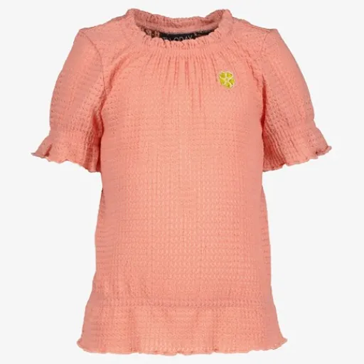 Koraal roze T-shirt voor meisjes. Voorzien van korte mouwen en een ronde hals. Het T-shirt heeft ruches bij de mouwen en aan de onderzijde. Gemaakt van polyester.