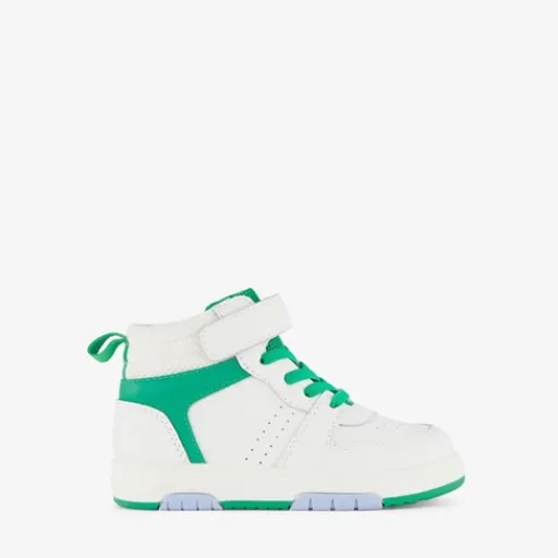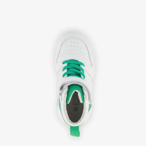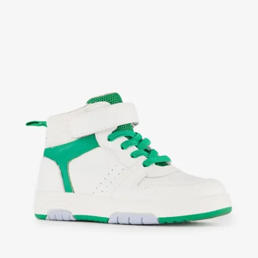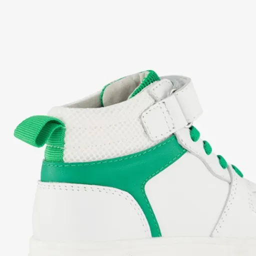 Hoge, witte jongens sneakers met groene accenten. Gemaakt van leer met een binnenwerk van leer en een stevige profielzool van rubber. Voorzien van elastische veters met een klittenbandsluiting en hiellusjes. Het buitenwerk bevat perforatiegaten en de comfortabele binnenzool is gemaakt van leer. De sneakers zijn gekeurd door Dr. Visser, wat de volgende garanties biedt: goede pasvorm, verstevigde hiel, bovenmateriaal van leer en een buigzame zool. Binnenzool is niet uitneembaar.