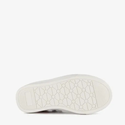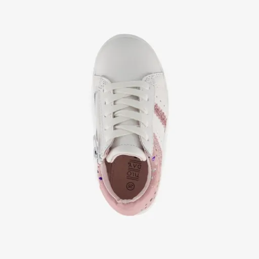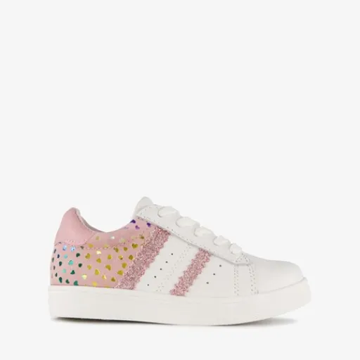 Witte meisjes sneakers met glitters en hartjes van TwoDay. Het buiten- en binnenwerk zijn gemaakt van leer en de profielzool is van rubber. Voorzien van een rits- en vetersluiting voor een optimale pasvorm en een comfortabele binnenzool van leer. Deze is niet uitneembaar. Het buitenwerk van de schoenen wordt versierd met roze accenten. De sneakers zijn gekeurd door Dr. Visser, wat de volgende garanties biedt: goede pasvorm, verstevigde hiel, bovenmateriaal van leer en een buigzame zool.