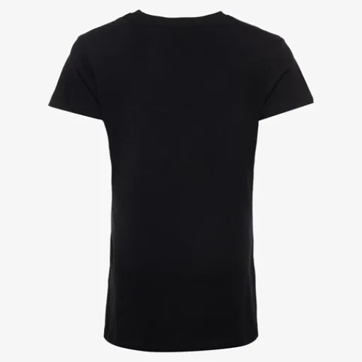 Zwart basic T-shirt voor meisjes. Voorzien van korte mouwen en een hoge, ronde hals. Het T-shirt heeft een comfortabele pasvorm en is gemaakt van katoen.