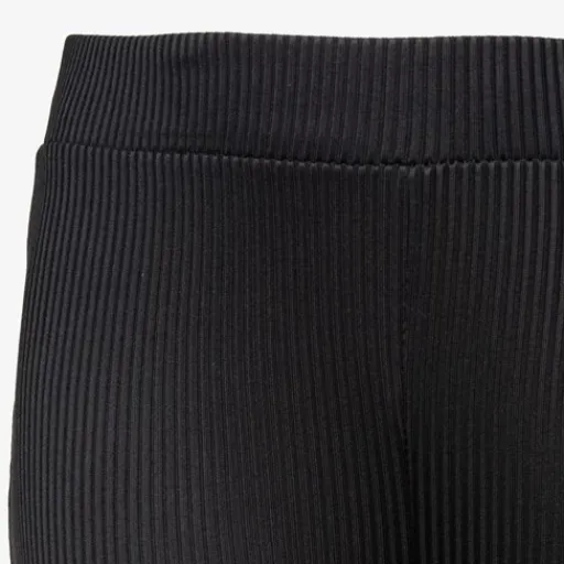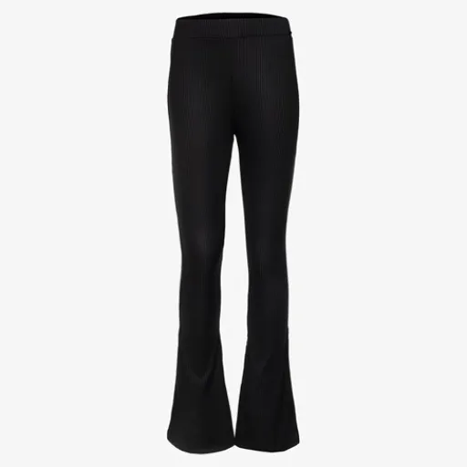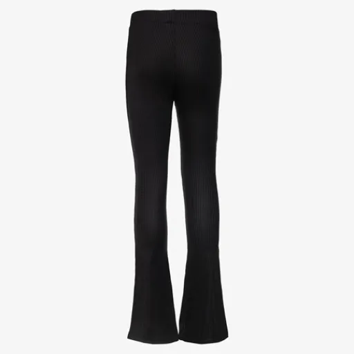 Zwarte flared ribbroek voor meiden. Voorzien van een elastische tailleband en aansluitende pasvorm. De broek heeft wijd uitlopende pijpen en een geribbeld patroon. Gemaakt van polyester.