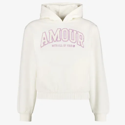 Beige hoodie voor meisjes van TwoDay. Voorzien van een capuchon, lange mouwen en elastische boorden. De hoodie heeft een tekstopdruk met teddy details aan de voorzijde. Gemaakt van 65% polyester en 35% katoen.