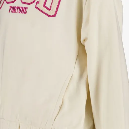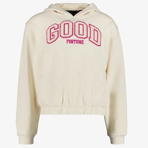 Beige trui voor meisjes van TwoDay. Deze lekkere warme hoodie heeft een capuchon en steekzakken aan de voorzijde. Voorzien van een opvallende roze tekstopdruk aan de voorzijde. Gemaakt van 65% polyester en 35% katoen.