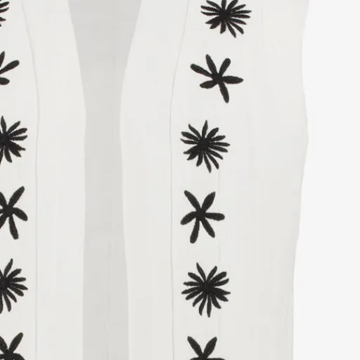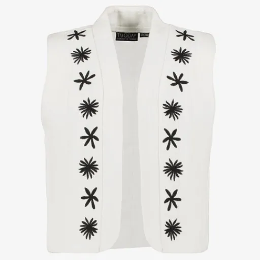 Wit jacquard gilet voor meisjes van TwoDay. Voorzien van zwarte borduurseltjes langs de boorden en gemaakt van 64% katoen en 35% polyester.