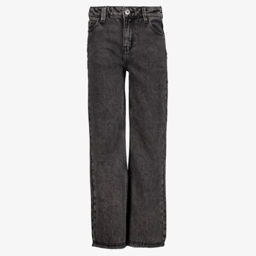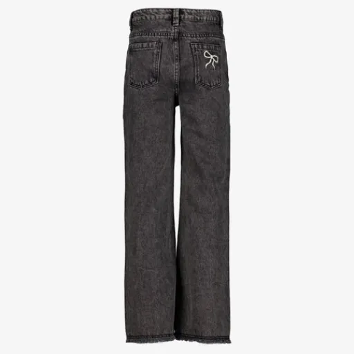 Donkergrijze jeans met wijde pijpen voor meisjes van TwoDay. Voorzien van een knoop- en ritssluiting, riemlusjes in de boord en twee voor- en achterzakken. De broek heeft een geborduurd strikje op een achterzak. Gemaakt van 100% katoen.