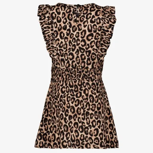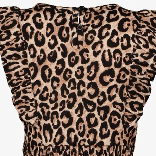 Meisjes jurkje met luipaardprint. Voorzien van een ronde hals met een knoopje in de nek, ruches bij de mouwen en elastiek in de taille. Het jurkje heeft all over luipaardprint en is gemaakt van 98% polyester en 2% elastaan.