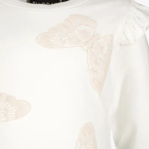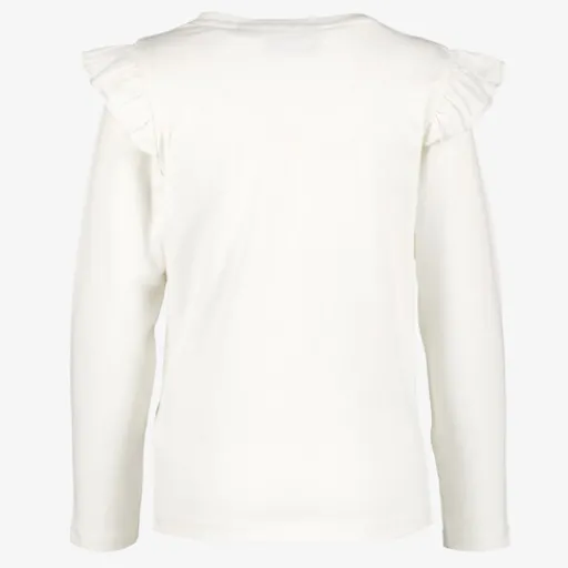Wit shirt voor meisjes. Voorzien van lange mouwen, een ronde hals en ruches op de schouders. Het shirt heeft roze vlinders aan de voorzijde en is gemaakt van 95% katoen en 5% elastaan.