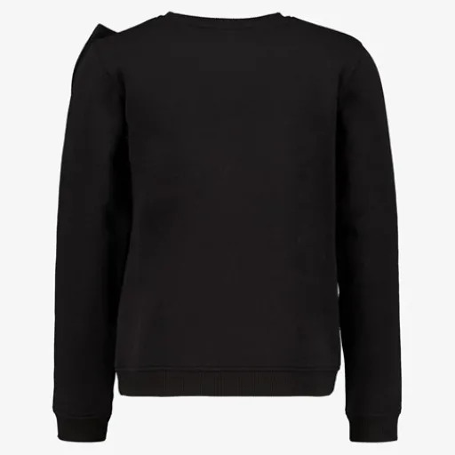 Zwarte sweater voor meiden. Voorzien van lange mouwen, een ronde hals en elastische boorden. De sweater heeft een grote strik op de schouder en is gemaakt van 65% katoen en 35% polyester.