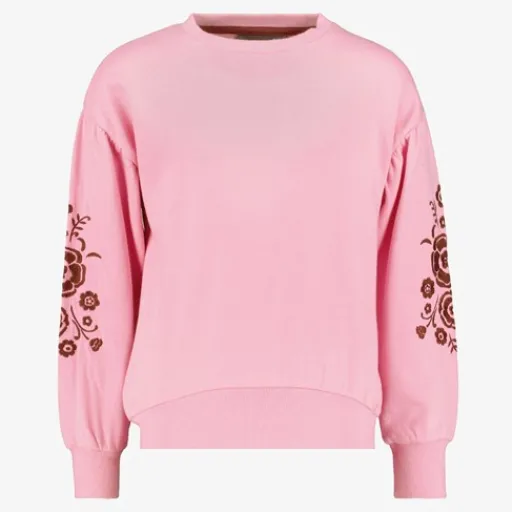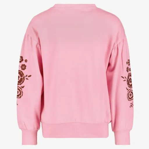 Roze sweater voor meisjes uit de TwoDay collectie. Voorzien van een ronde hals, lange mouwen en elastische boorden. Deze leuke trui heeft geborduurde bloemen op de mouwen en is gemaakt van 100% katoen.