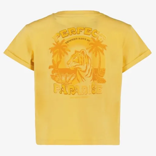 Geel T-shirt voor meisjes. Voorzien van korte mouwen, een kleine opdruk op de borst en een grote backprint. Gemaakt van 100% katoen.